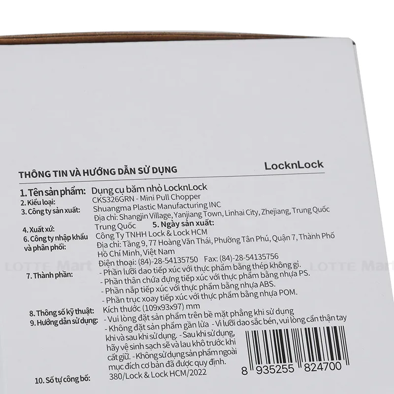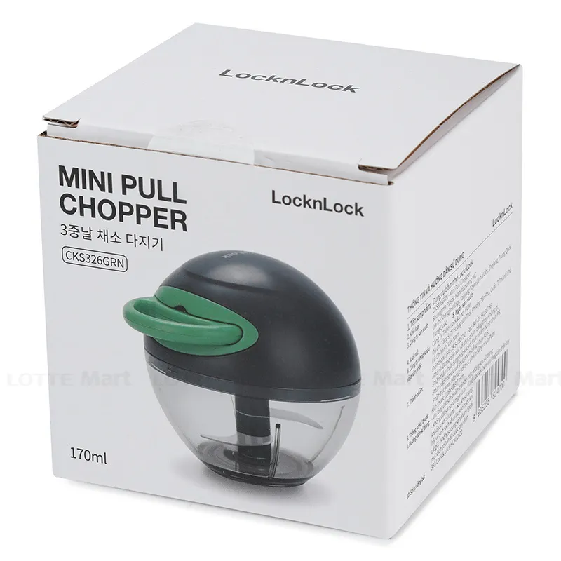Băm nhỏ thực phẩm là công việc thường thấy trong khi nấu ăn. Chính vì vậy, dụng cụ băm nhỏ thực phẩm mini Lock&Lock CKS326GRN giúp cho phần việc này trở nên dễ dàng, nhanh chóng và đơn giản hơn bao giờ hết. Lưỡi dao bằng thép không gỉ, giúp cắt nhỏ thực phẩm nhanh chóng. Thân làm từ nhựa PS, nắp làm bằng nhựa ABS, trục xoay dao làm từ nhựa HDPE, an toàn không thôi nhiễm chất độc hại vào thực phẩm. Cối nhựa trong suốt, dễ quan sát thực phẩm bên trong. Cấu tạo đơn giản, dễ tháo rời và vệ sinh. Kích thước: 93 x 93 x 85mm. Dung tích: 180ml. Hướng dẫn sử dụng: Cắt thực phẩm: hành tỏi, gia vị thành miếng nhỏ và đặt vào hộp chứa. Cân chỉnh trục giữa của nắp với lỗ của trục lưỡi dao và xoay để khớp cố định. Giữ nắp bằng một tay và nhẹ nhàng kéo bằng tay còn lại để băm thực phẩm. Lưu ý: Đặt dao thép không gỉ vào hộp để căn chỉnh trục lưỡi dao vào đúng vị trí.