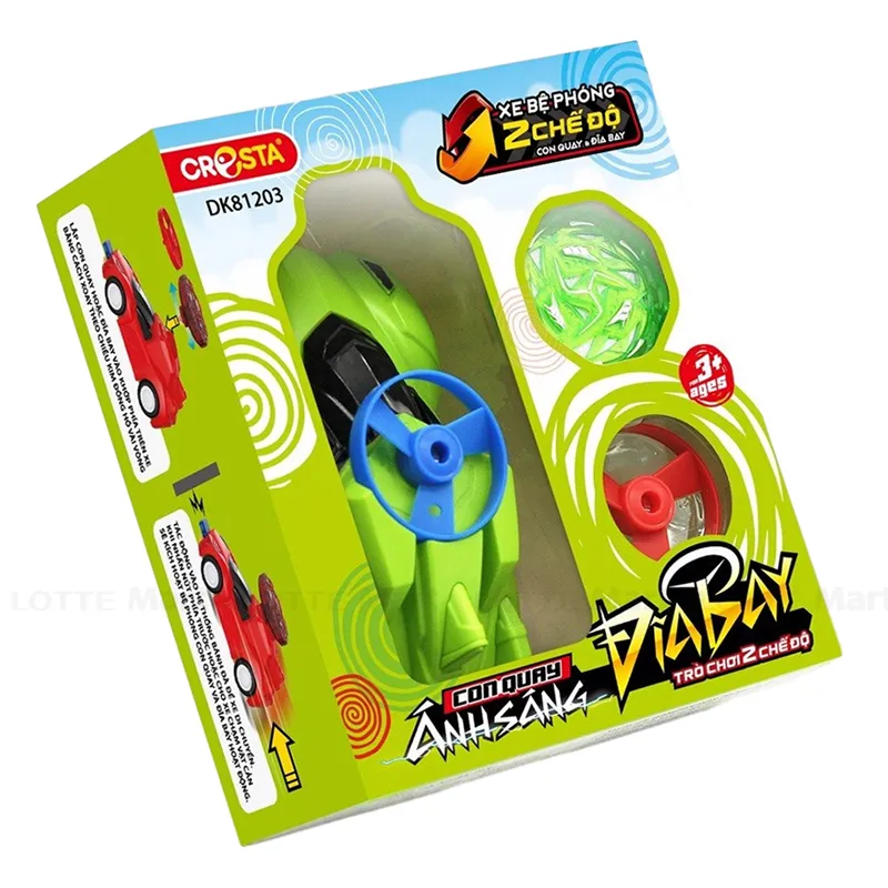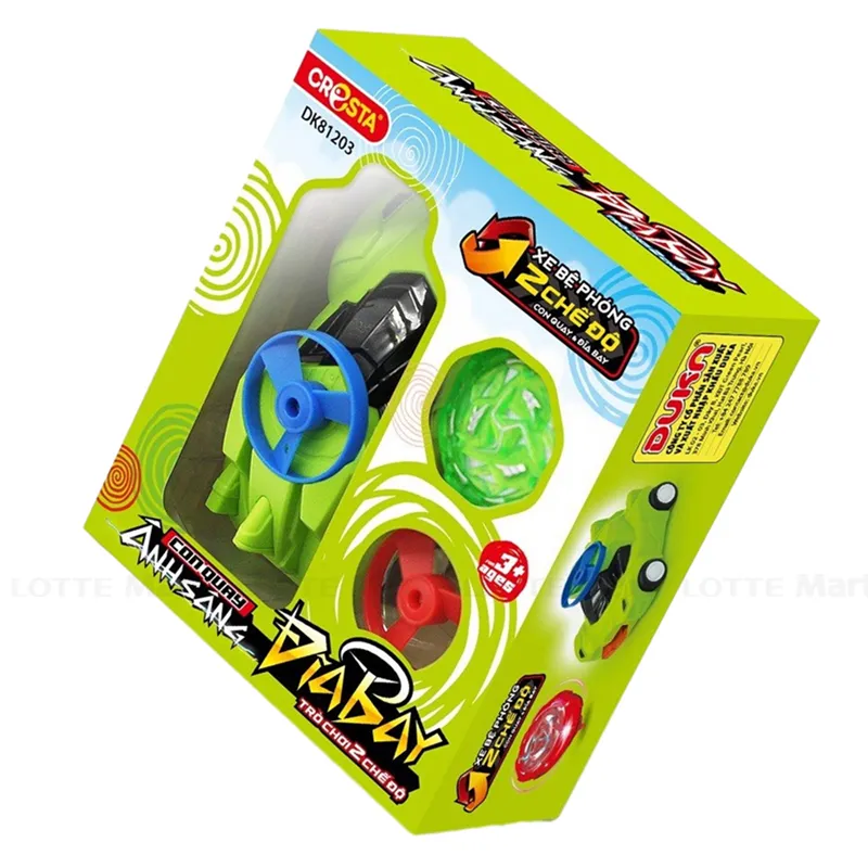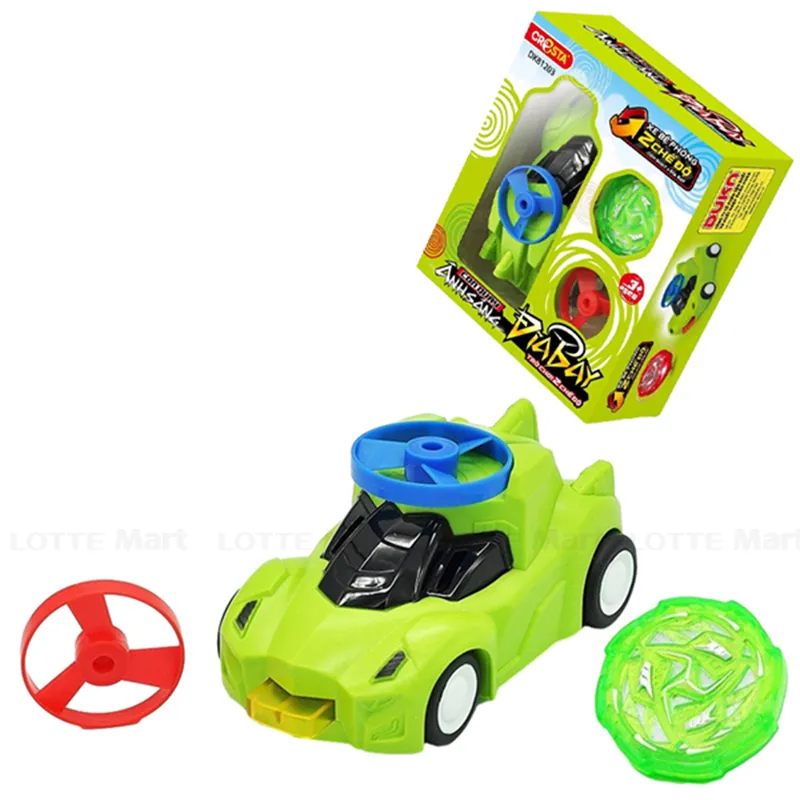 - Phụ kiện chính kèm theo là chiếc ô tô mô hình được thiết kế bằng nhựa ABS nguyên khối, chịu được lực va chạm mạnh và ở mũi xe đều có các nút bật khi có lực tác động giúp con quay và đĩa bay vút lên cao.