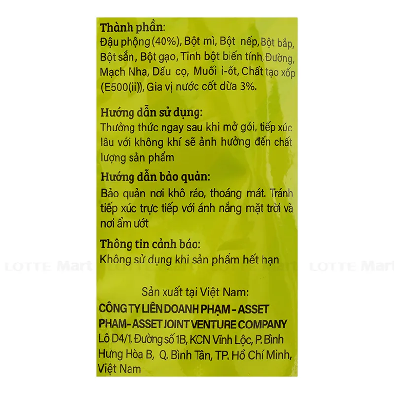 - Đậu phộng 40%, bột mì, bột nếp, bột bắp, bột sắn, bột gạo, tinh bột biến tính, đường, mạch nha, dầu cọ, muối i-ốt, chất tạo xốp, gia vị nước cốt dừa 3%...