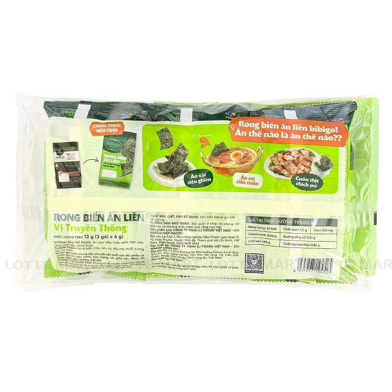 - Rong Biển Ăn Liền bibigo Vị Truyền Thống là sản phẩm hoàn hảo cho những ai yêu thích ẩm thực Hàn Quốc. Rong biển được chế biến từ 100% nguyên liệu nhập khẩu từ Hàn Quốc, mang hương vị đậm đà và và chứa các chất dinh dưỡng tự nhiên vốn có từ vùng biển sạch.