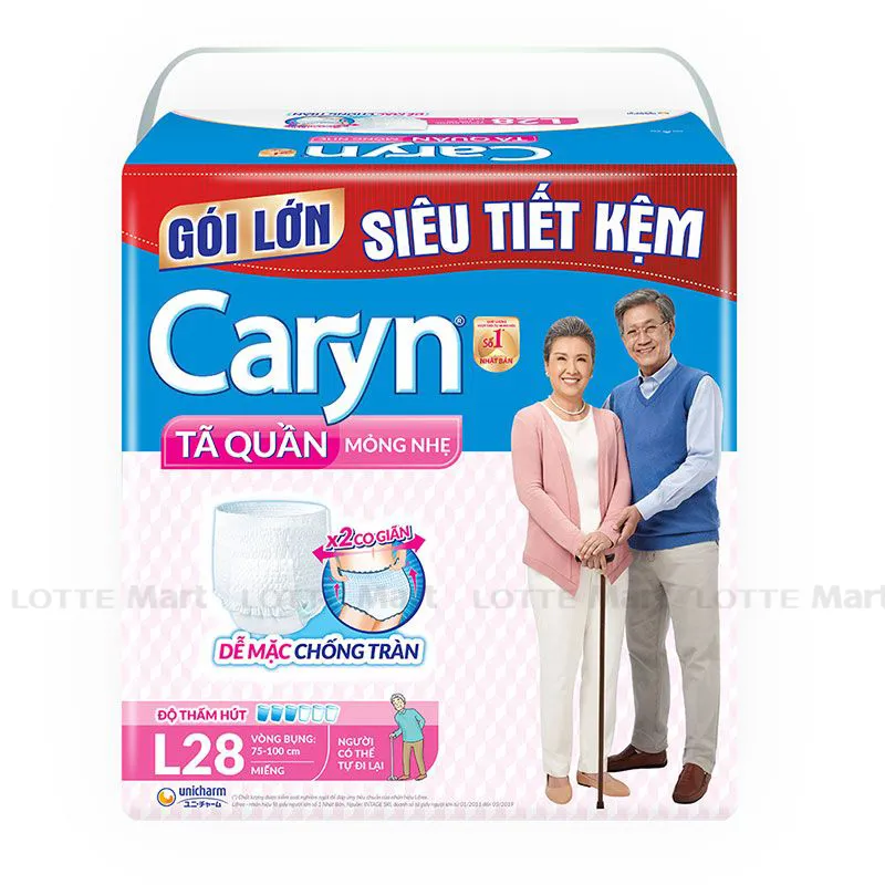 Tã Quần Caryn Mỏng Nhẹ Size L Gói 28 Miếng (Vòng Bụng 75-100cm) cải tiến mới có đầy đủ tính năng của một miếng tã quần lý tưởng: Dễ mặc – Chống tràn – Thoải mái khi vận động. Sản phẩm phù hợp với những người gặp vấn đề về bài tiết mà vẫn có thể tự đi lại mà không cần sự hỗ trợ của người khác (có thể sử dụng công cụ hỗ trợ)