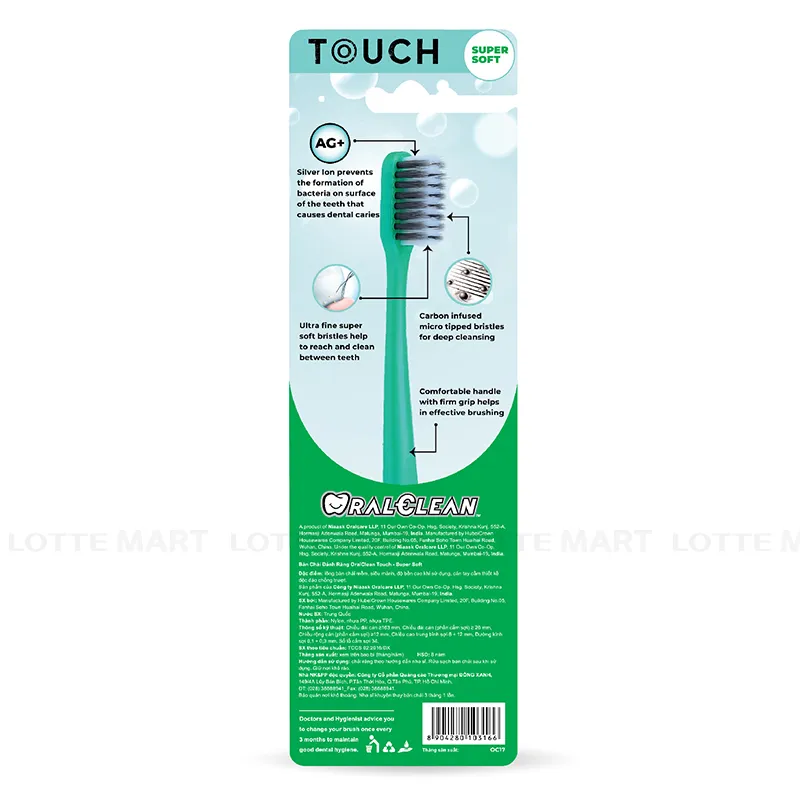 Bàn Chải Đánh Răng Oral Clean Touch Super Soft Bộ 2 Cây với chất liệu lông tơ mềm mại chải sạch các kẽ răng cho răng chắc khỏe. Thành phần than tre giúp chải sạch hơn.
