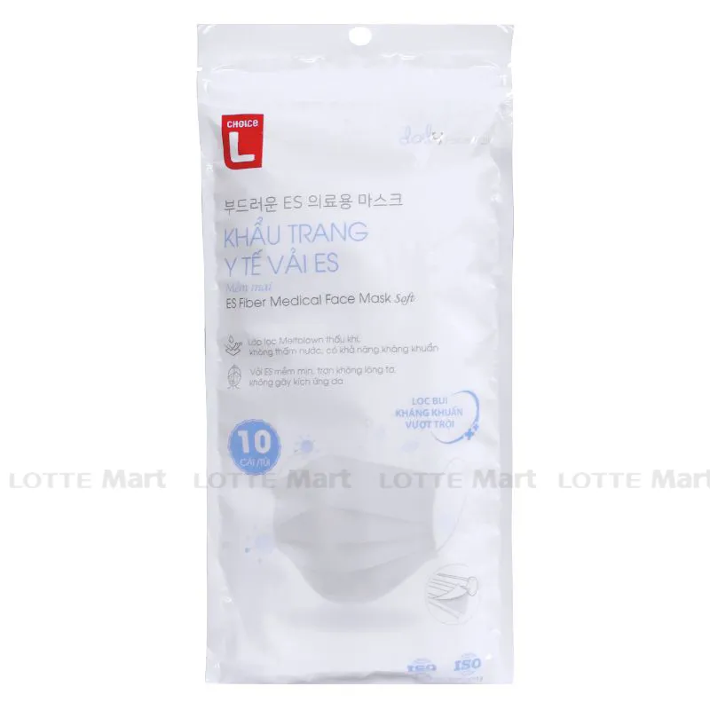 - Khẩu Trang Y Tế Vải ES Choice L Lọc Bụi Kháng Khuẩn Vượt Trội Túi 10 Cái có tác dụng ngăn ngừa bụi, vi khuẩn, virus và các bệnh lây qua đường hô hấp nhờ lớp lọc kháng khuẩn cao cấp. Khẩu trang được sản xuất ở Việt Nam với dây chuyền công nghệ khép kín. Chất liệu vải tự nhiên, dày mịn, không gây khó chịu.Thanh nẹp mũi thiết kế thông minh giúp định hình giữ khẩu trang. Sản phẩm không thấm nước, không gây dị ứng da, an toàn cho người sử dụng. Dây deo đàn hồi mềm mại, không gây cảm giác đau tai khi sử dụng lâu dài, thiết kế thông minh nên giúp dễ dàng hít thở, đem lại cảm giác thoải mái khi đeo.