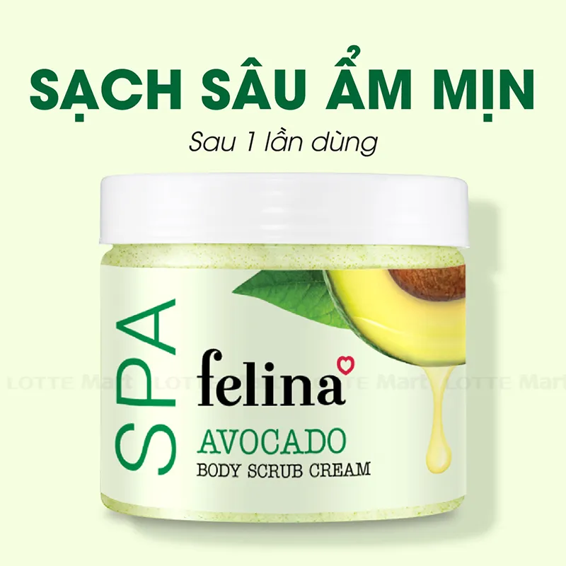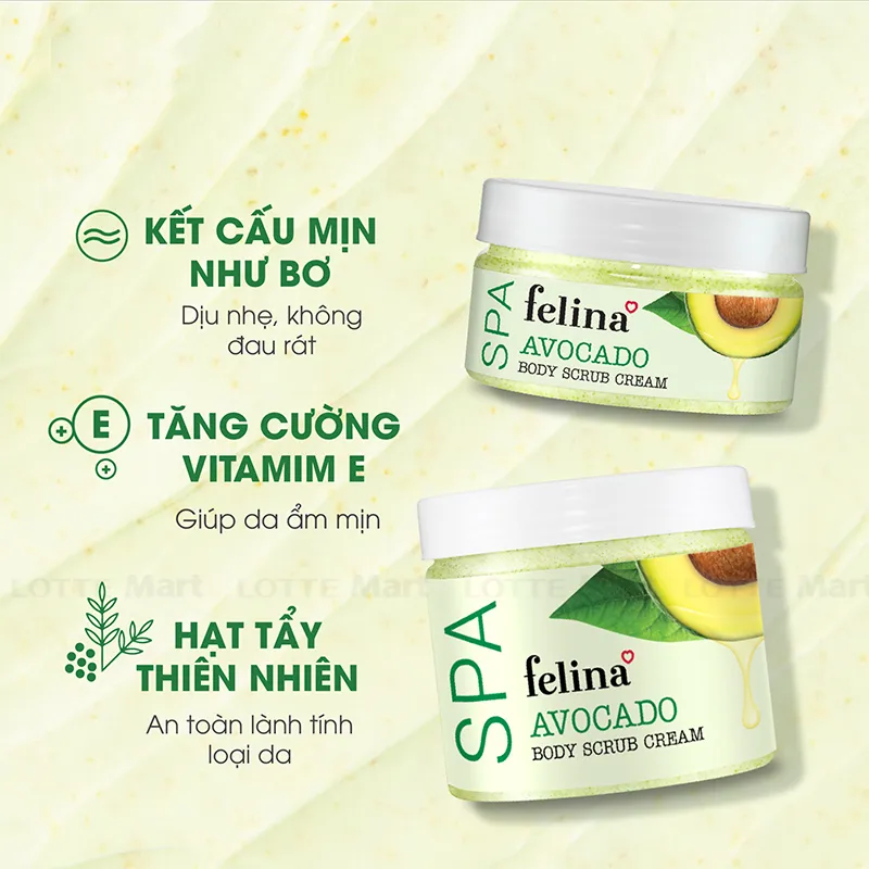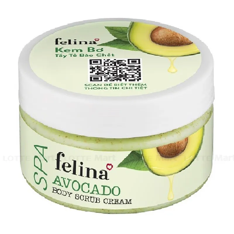 - Sản phẩm mới Tẩy Tế Bào Da Chết Felina Kem Bơ với sự kết hợp của chiết xuất bơ nghiền nguyên trái giàu chất béo và vitamin E cùng hạt tẩy thiên nhiên nhuyễn mịn, lành tính giúp làn da sạch sâu, nuôi dưỡng và giữ cho da ẩm mịn, mềm mại chỉ sau 1 lần sử dụng.