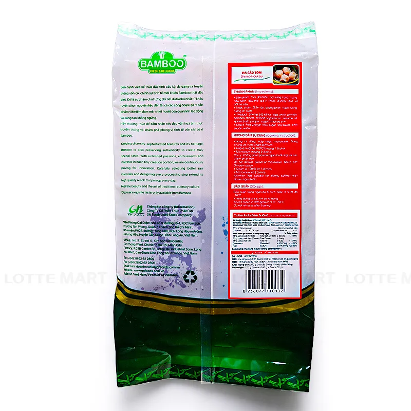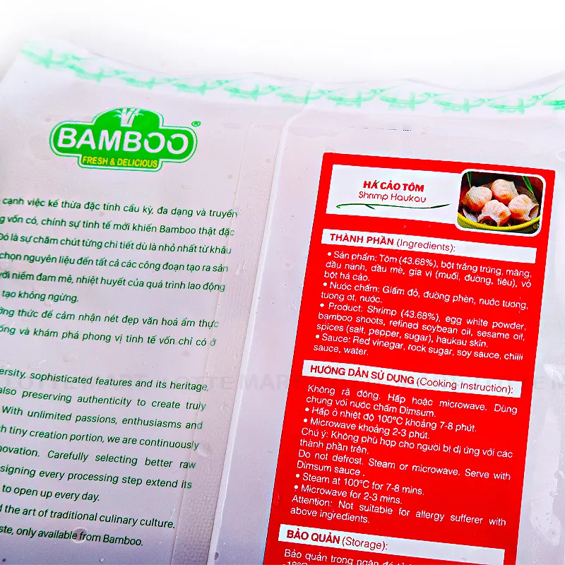 Há Cảo Tôm Bamboo Gói 270g làm từ các thành phần nguyên liệu đã qua chọn lọc kĩ, bao gồm vỏ bột há cảo, tôm, muối, đường, dầu mè tạo nên những viên há cảo tôm chất lượng từ lớp vỏ dai mềm với độ dày vừa phải đến lớp nhân thơm sần sật được nêm gia vị vừa ăn.
