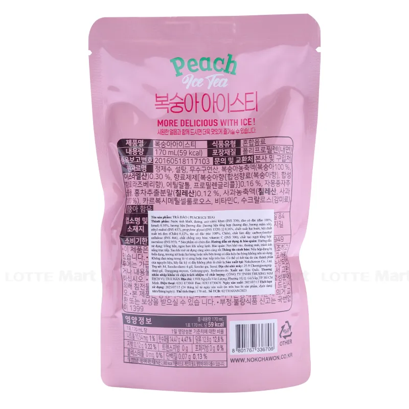 - Trà Đào Nokchawon Túi 170ml với tinh chất nước ép đào, nước cốt hồng trà tự nhiên mang lại hương vị thơm ngon. Sản phẩm mang hương vị độc đáo đến từ thương hiệu Nokchawon Hàn Quốc.