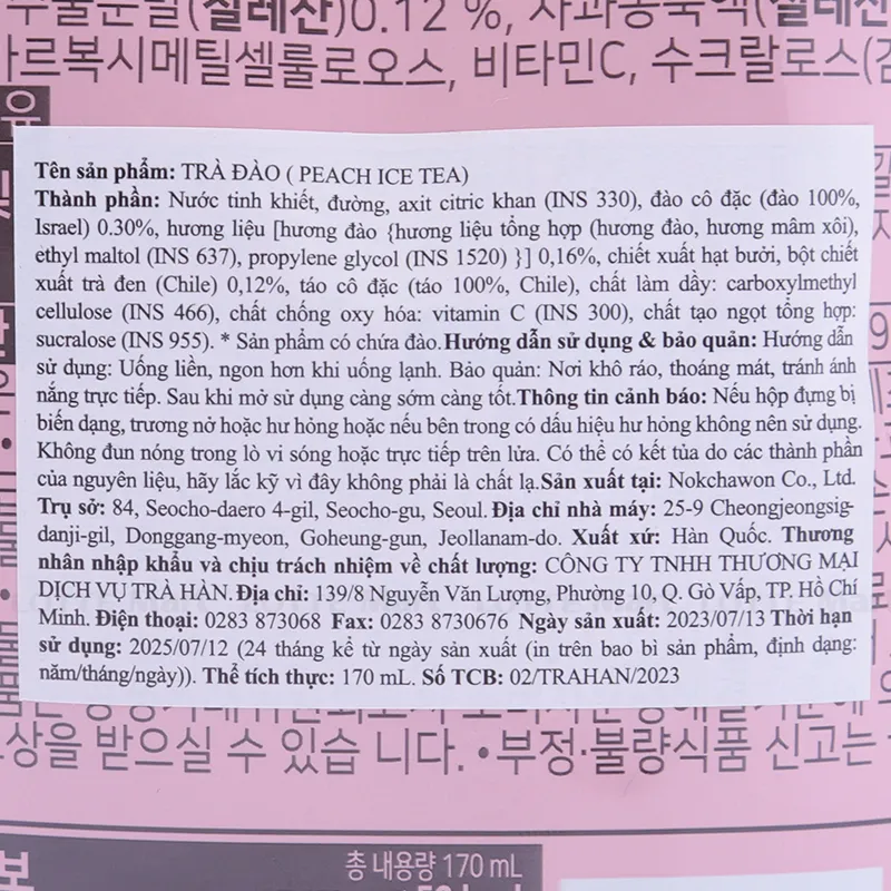 - Nước ép đào 30% (phần thịt quả 1.84%, Hàn Quốc), fructose lỏng, đường tinh luyện, nước cốt hồng trà (Xrilanca), hương tổng hợp (hương đào), sodium citrate (E331), chất làm đặc (sodium carboxymethyl cellulose (E466)), nước ép táo đậm đặc, xylitol (E967), caramel dạng lỏng, Acesulfame Potassium (E950), chất bảo quản (sodium benzoate (E211)), nước tinh khiết.