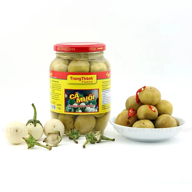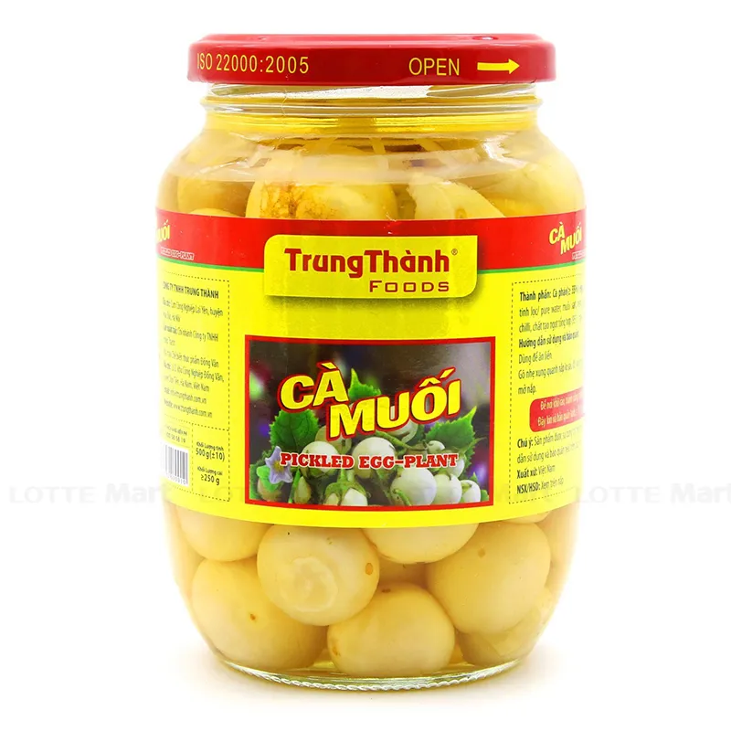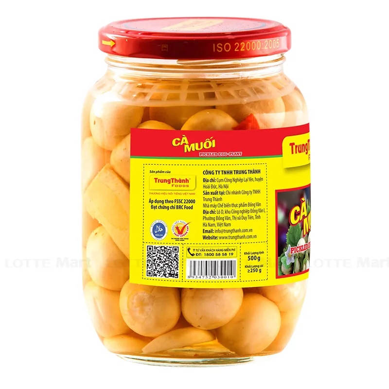 - Cà Muối Trung Thành được chế biến sản xuất theo quy trình hiện đại, khép kín theo tiêu chuẩn ISO 22000:2005. Sau khi thu hoạch từ nông trại, những trái cà đạt chuẩn được đem vào chế biến. Đó là những trái cà còn căng tròn, màu sắc tươi sáng, không sâu bệnh, không biến dạng, đủ chỉ tiêu về hàm lượng thuốc bảo vệ thực vật.