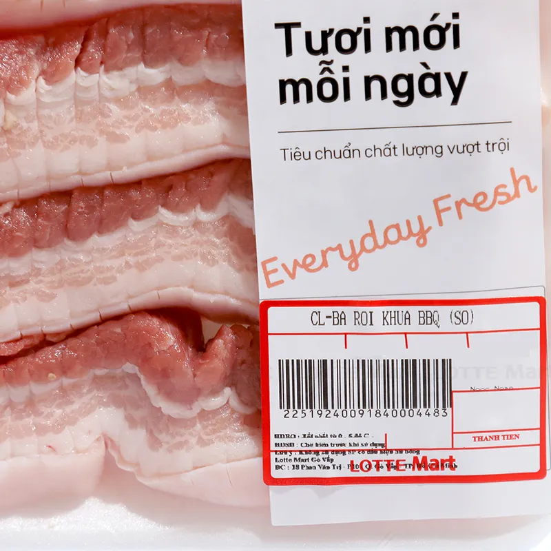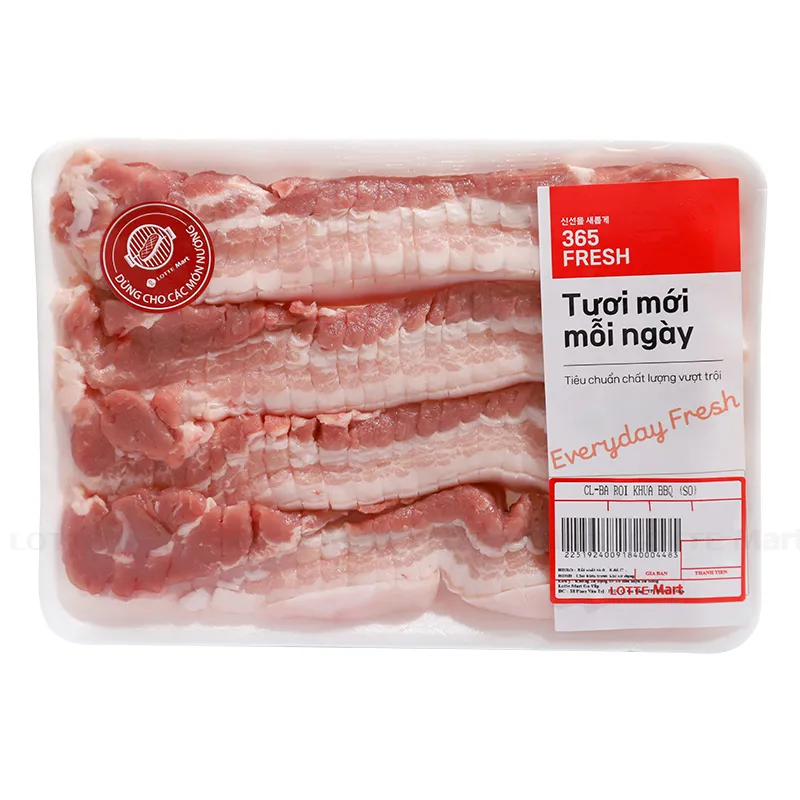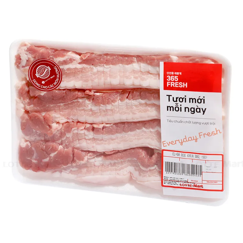 - Ba rọi khứa BBQ 365 Fresh là phần thịt ba chỉ khi cắt ngang sẽ thấy được phần thịt và mỡ xen kẽ 3 lớp với nhau theo thứ tự lớp thịt, mỡ rồi lại đến lớp thịt.