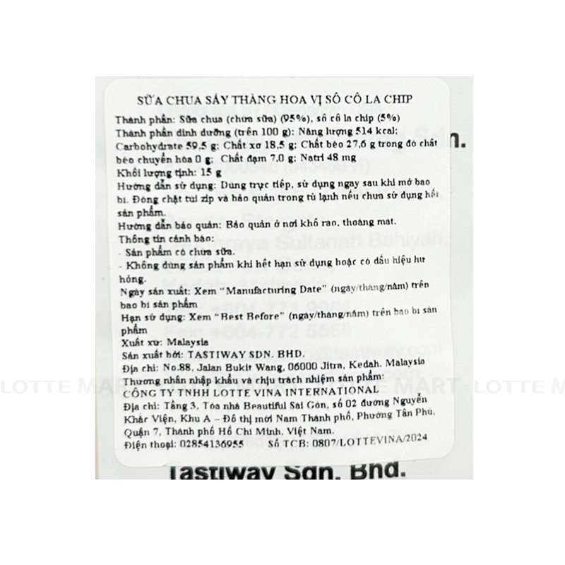 - Sữa chua (76%) [sữa tiệt trùng, đường, men nuôi cấy (các loài Bifidobacterium, Lactobacillus acidophilus, Lactobacillus delbrueckii subsp. bulgaricus, Streptococcus thermophilus)], sô cô la chip (24%)