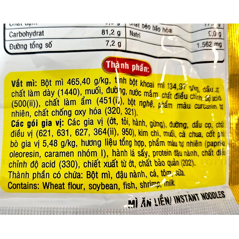 CÁC GÓI GIA VỊ - Đường, ớt, dầu tinh luyện (dầu cọ, chất chống oxy hoá (BHA (320), BHT (321)), tỏi, chất điều vị (mononatri glutamat (621)), dinatri 5'-inosinat (631), dinatri 5'-guanylat (627), disodium succinate), kim chi (cải thảo 85,0%, nước mắm, mắm tép), muối, cà chua, các gia vị (hành, gừng), chiết xuất phở bò 6,23 g/kg (thịt bò, maltodextrin, muối), hương bò tổng hợp 3,73 g/kg, thành phần có chứa đậu nành, sữa), phẩm màu tự nhiên (paprika oleoresin (160c), giả thịt (đậu nành), phẩm màu tổng hợp (caramen nhóm I (150a)), chất điều chỉnh độ acid (acid citric (330)), chất tạo ngọt tổng hợp (acesulfam kali (950)), chiết xuất từ ớt, hương tiêu tổng hợp, chất bảo quản (kali sorbat (202)).