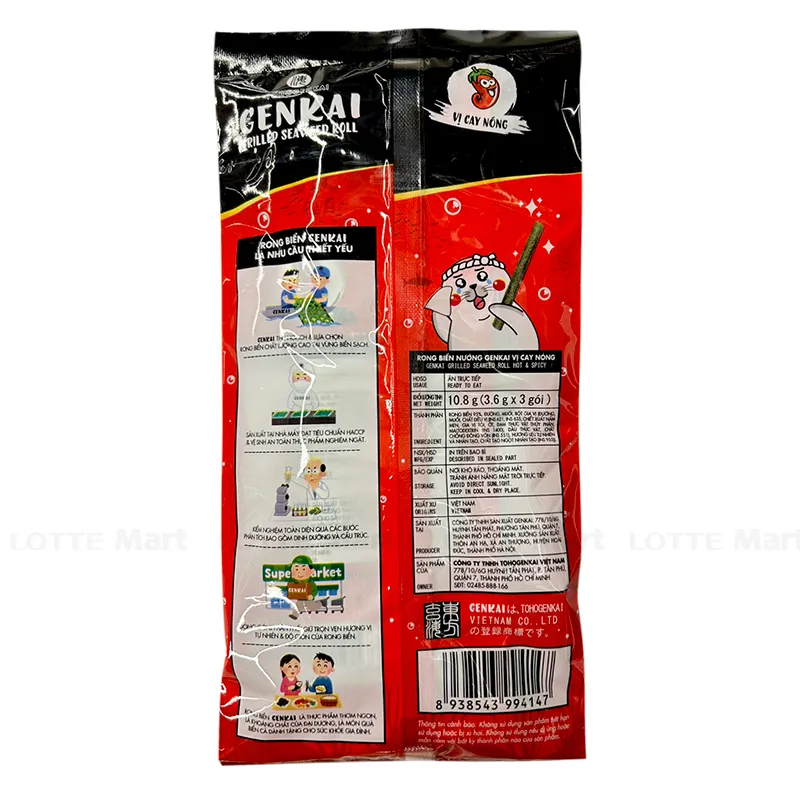 Lốc 3 Gói Tảo Biển Cuộn Nướng Tohogenkai Vị Cay Nóng 10.8g (3.6G x 3 Gói) dạng cuộn giòn tan, chứa hàm lượng dinh dưỡng cao, vị cay nóng hấp dẫn, khẩu vị hợp với người Việt Nam. Snack rong biển Tohogenkai được chọn lọc kỹ lưỡng từ nguồn nguyên liệu sạch, đã qua quá trình kiểm định độ an toàn.