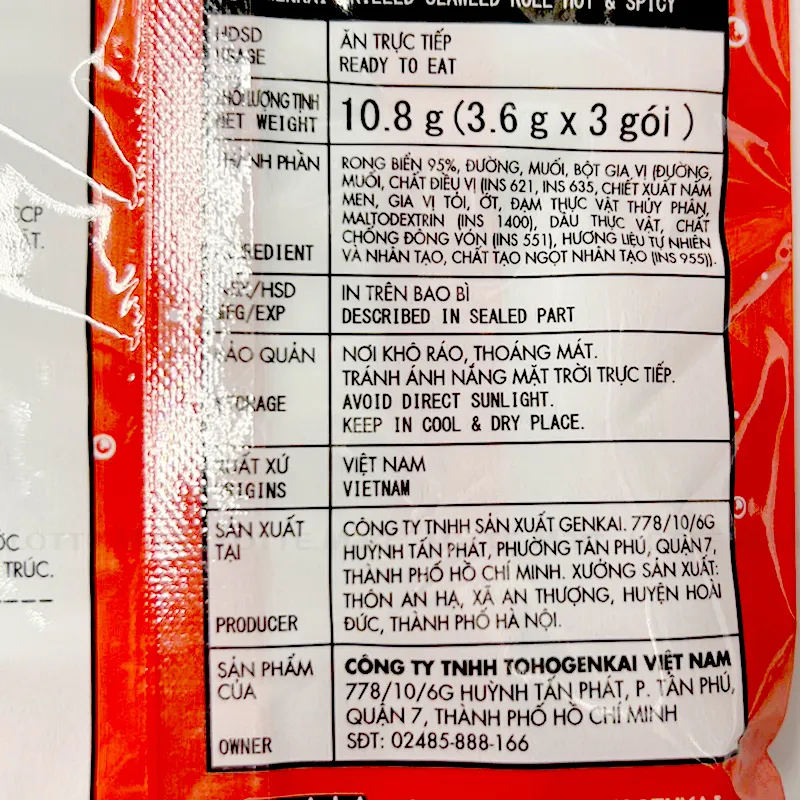 Thành phần: Tảo biển 95%, đường, Protein đậu nành thủy phân, tiêu, muối, ớt. Sản phẩm thích hợp dùng cho trẻ từ 12 tháng tuổi trở lên.