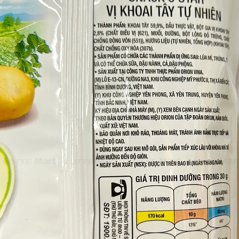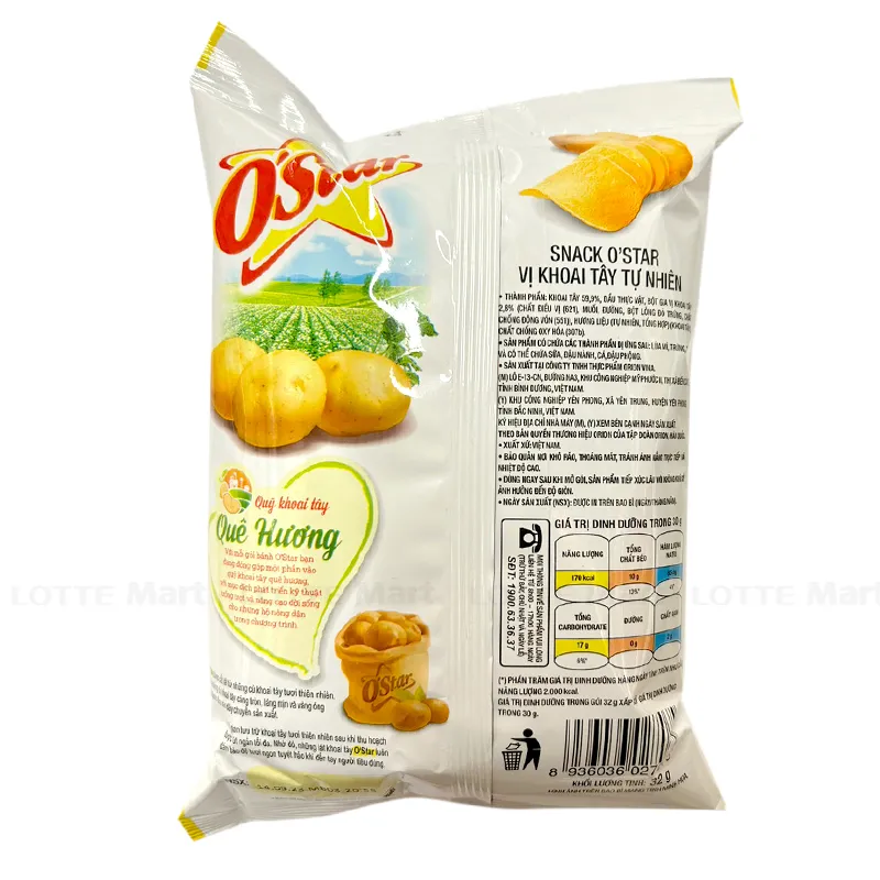 Snack khoai tây vị muối O'Star Orion được chế biến từ khoai tây Việt Nam tươi tự nhiên 100%. Thời gian lưu trữ khoai tây tươi sau khi thu hoạch được rút ngắn tối đa, nhờ đó mà hương vị của sản phẩm luôn đảm bảo độ tươi ngon tuyệt hảo.