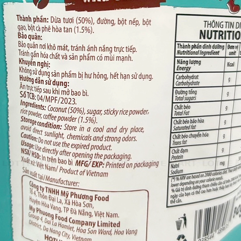 - Dừa tưới 50%, đường, bột nếp, bột gạo, cà phê hòa tan (1.5%).