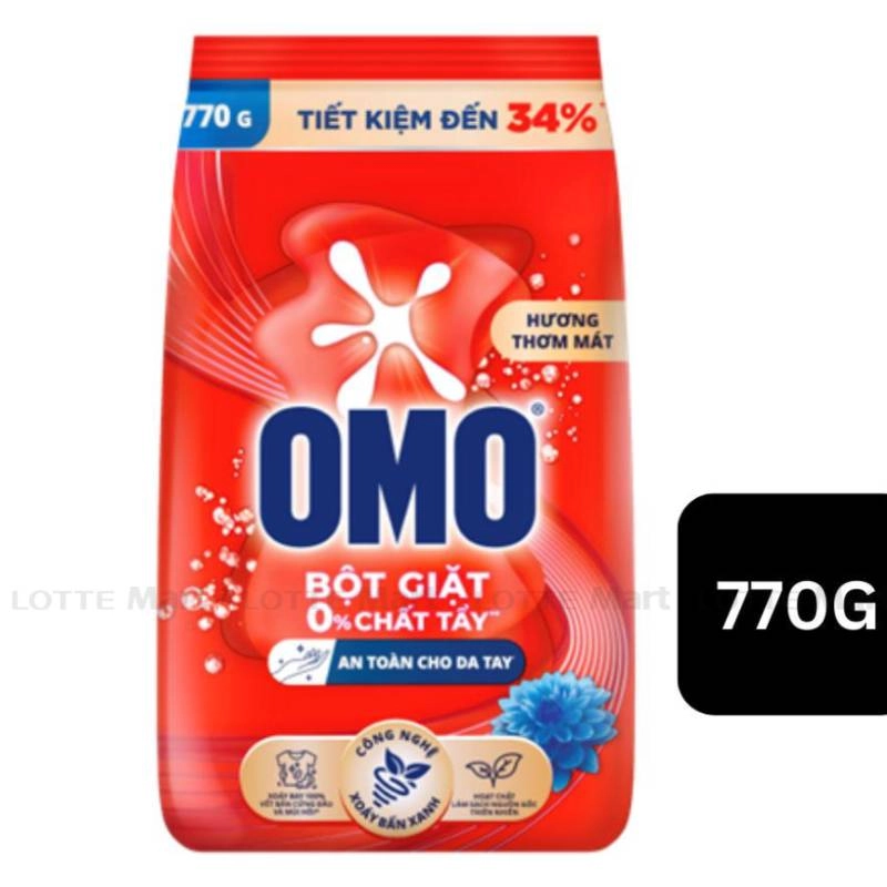 Bột Giặt Omo Sạch Bẩn Khử Mùi Công Nghệ Giặt Xanh Túi 770g sẽ giúp đánh bay nhiều loại vết bẩn một cách nhanh chóng với công nghệ đột phá mới sẽ chứa các hạt tinh thể làm sạch vượt trội. Hương thơm nhẹ nhàng dài lâu cho quần áo của bạn. Không cần ngâm quần áo lâu, không cần mất công chà, không cần mua thêm bất kỳ công cụ hỗ trợ nào. Sản phẩm là sự kết hợp độc đáo giữa công nghệ giặt trắng, giữ màu và hương thơm tự nhiên, cho bạn luôn tự tin diện trang phục sạch đẹp, thơm mát mỗi ngày. Bột Giặt Omo Đỏ chỉ sử dụng nguyên liệu chất lượng cao, đáp ứng các tiêu chuẩn quốc tế nghiêm ngặt về phân hủy sinh học và an toàn.