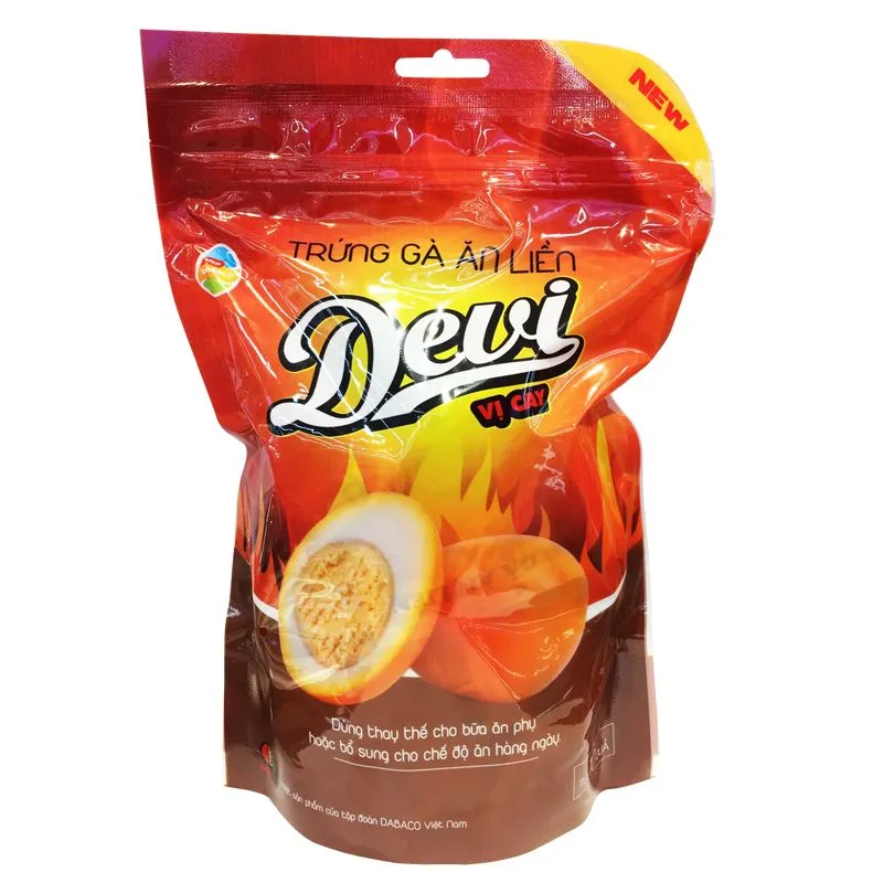 1. Trứng gà ăn liền vị cay Devi Dabaco túi 10 quả được luộc sẵn, bóc vỏ ngâm thảo mộc sử dụng vô cùng tiện lợi chỉ việc bóc túi bọc bên ngoài và thưởng thức.