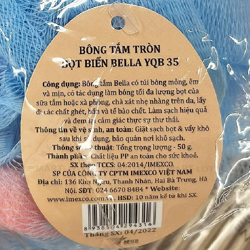 Bông Tắm Bella+ Bọt Biển YQB35 Gói 50Gcó các búi bông bọt biển mềm xốp tạo bọt tốt, không chỉ loại bỏ chất bẩn trên da một cách nhẹ nhàng và hiệu quả nhất, mà còn giúp tiết kiệm tối đa nếu bạn tắm bằng các sảm phẩm xà bông,sữa tắm
