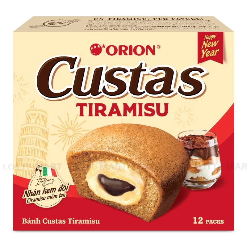 - Bánh Custas Orion Vị Tiramisu Hộp 276G là một loại bánh bông lan nhân kem tiramisu, có hương vị ngọt ngào của kem phô mai và thơm mát của cà phê và hương vị đắng nhẹ của bột cacao. Bánh bông lan mềm thơm, tơi xốp, hòa quyện với lớp nhân custard nâu cà phê, béo ngậy, tan chảy ngay đầu lưỡi.