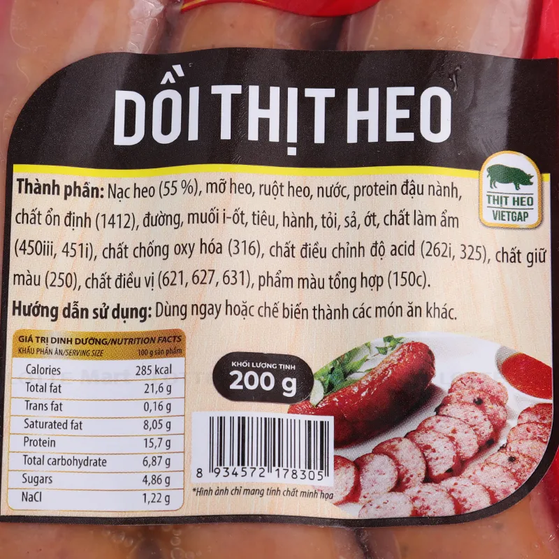 Thành phần: Nạc heo, mỡ heo, ruột heo, protein đậu nành, protein sữa, đường, muối, tiêu, hành, tỏi, sả, ớt...