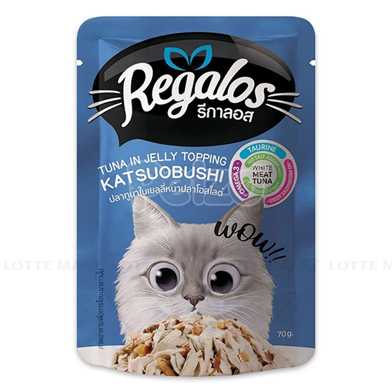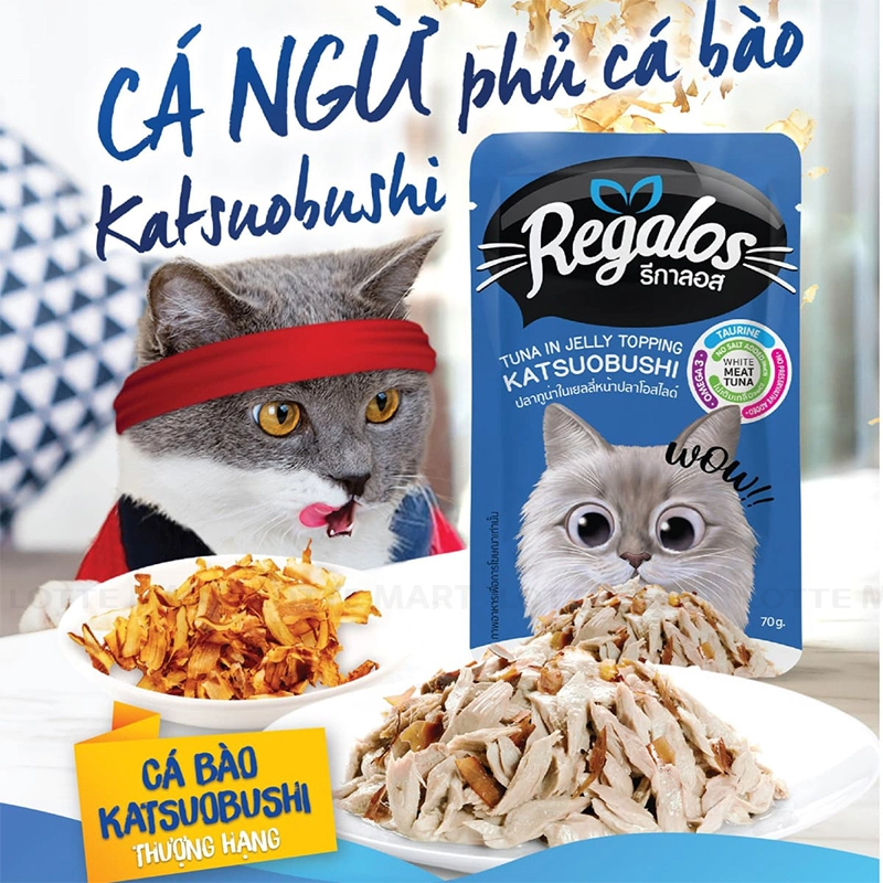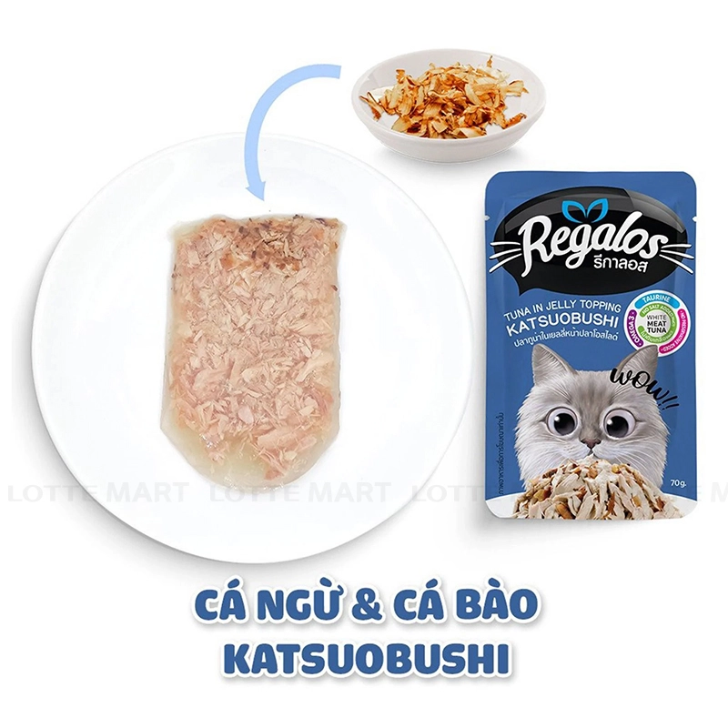 - Pate Cho Mèo Dạng Jelly Regalos Vị Cá Ngừ Topping Cá Bào 70g với công thức chế biến hiện đại khoa học, đáp ứng đầy đủ nhu cầu dinh dưỡng cho cơ thể mèo cưng.