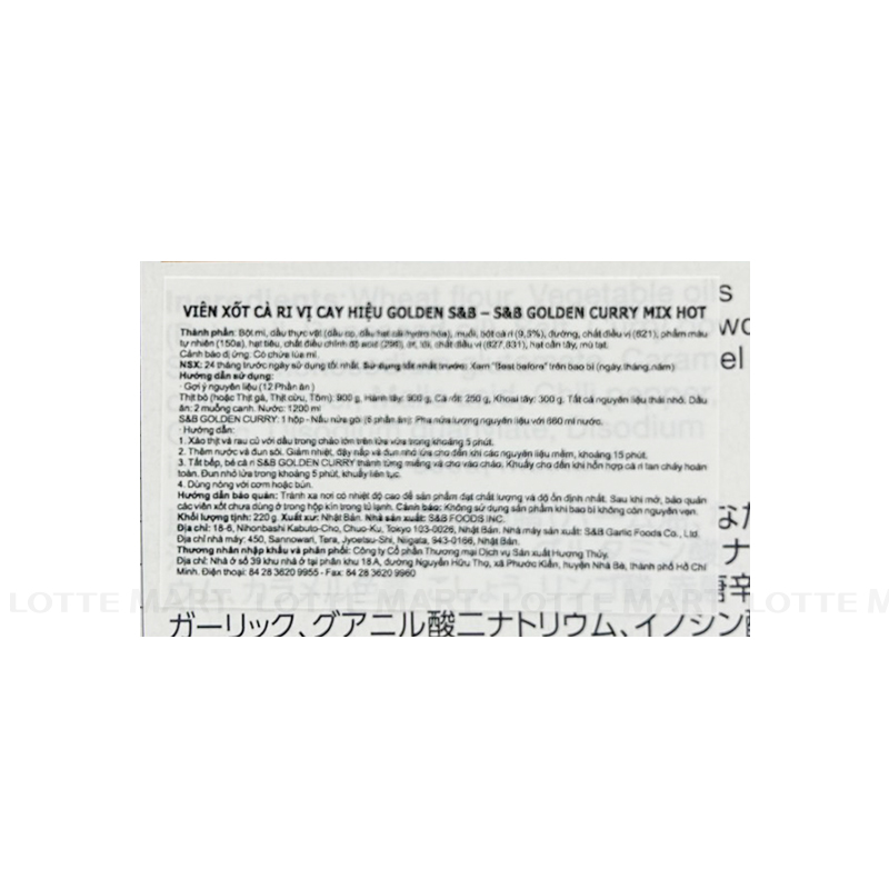 - Viên Cari Golden S&B Vị Cay 220G được sản xuất trên dây chuyền công nghệ hiện đại, dưới sự giám sát của các chuyên gia Nhật Bản. Mỗi sản phẩm của S&B phân phối đều đảm bảo được đầy đủ các tiêu chuẩn về chất lượng và vệ sinh an toàn thực phẩm.