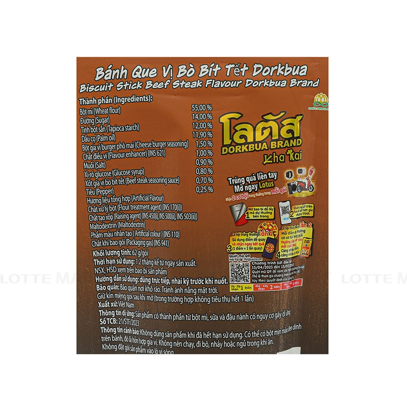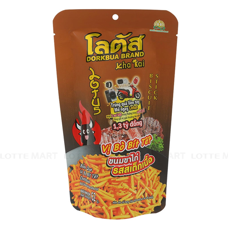 - Bánh Que Dorkbua Vị Bò Bít Tết làm từ các nguyên liệu chất lượng. Hương vị bò bít tết đậm đà, tạo nên một trải nghiệm ẩm thực đầy thú vị. Sự hòa quyện giữa vị mặn, ngọt và chút cay nhẹ làm cho món snack này trở nên lôi cuốn.