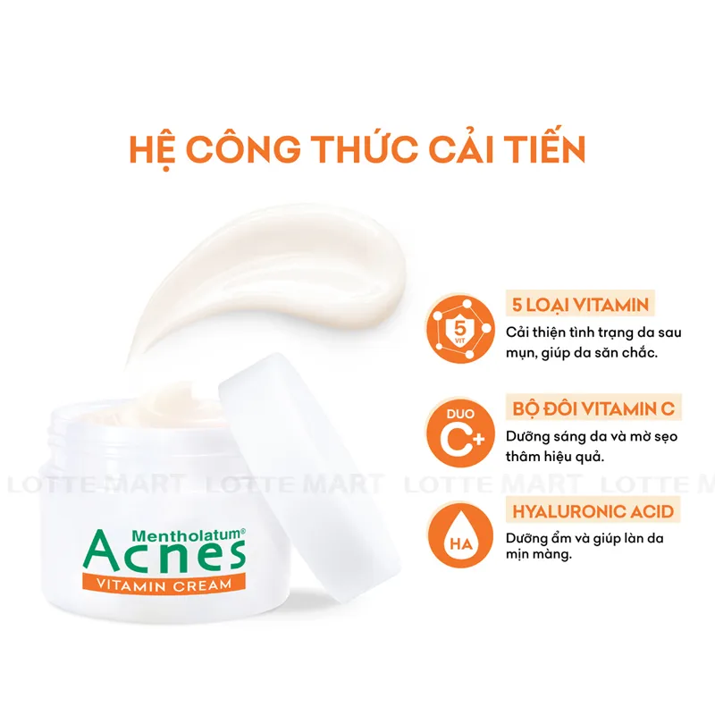 Kem Dưỡng Acnes Vitamin Sáng Da Mờ Sẹo Thâm Hũ 40G cung cấp một bảng thành phần giàu vitamin và dưỡng chất hỗ trợ chữa lành tế bào và mô tổn thương liên tiếp do mụn khiến cấu trúc da trở nên kém đàn hồi, sần sùi, tối màu. Đồng thời nuôi dưỡng và trẻ hóa làn da sau mụn: da sáng mịn, săn chắc hơn, các vết thâm mờ hơn. Dưỡng ẩm, khóa ẩm, giúp làn da thêm căng bóng mịn màng, Hỗ trợ làm mờ nám và tàn nhang, cải thiện sắc tố da. Giảm kích ứng, phục hồi làn da đang yếu.
