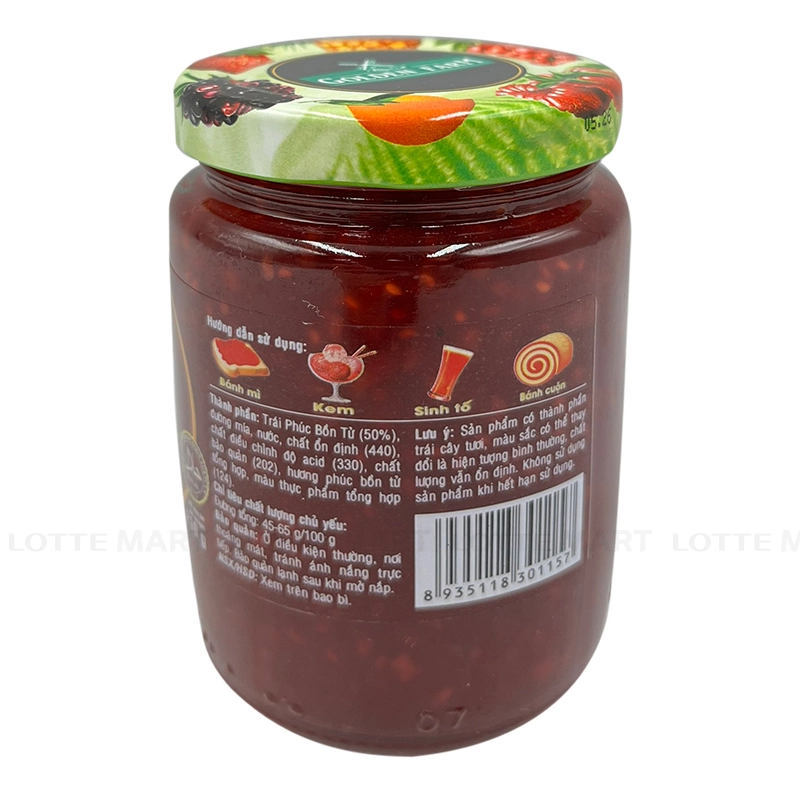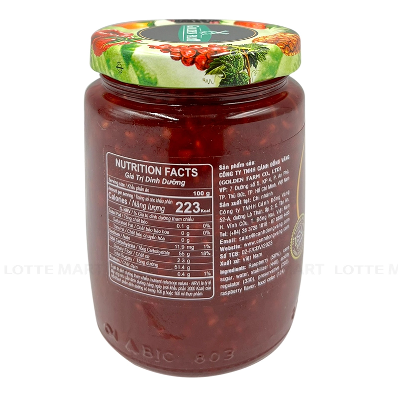 Mứt Phúc Bồn Tử Golden Farm 210g - với thành phầnphúc bồn tử trái thơm tươi được chọn lọc kỹ càng cùng hương liệu tự nhiên sẽ mang đến cho bạn món mứt ngọt và chua vừa phải, kích thích cảm giác ăn uống.