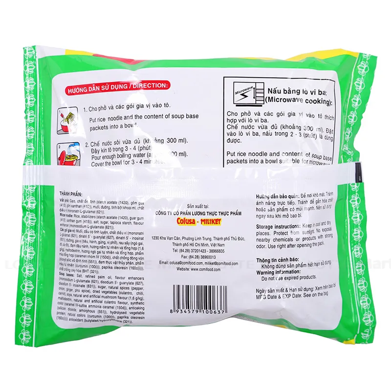 Hướng dẫn sử dụng: Cho bánh phở và các gói gia vị vào bát. Chế khoảng 300ml nước sôi, đậy nắp chờ trong 3 phút sau đó trộn đều và thưởng thức.