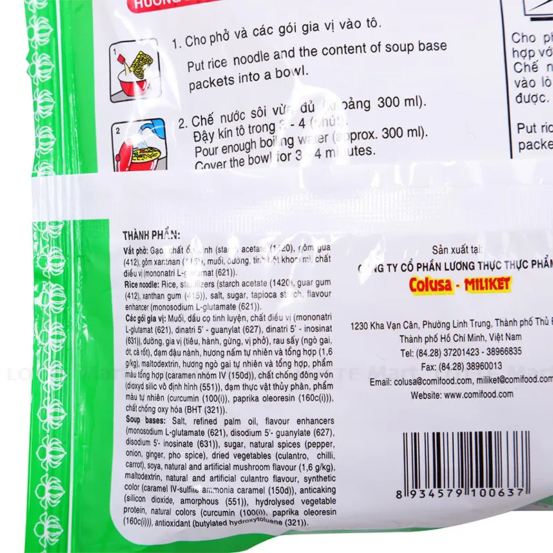 Thành phần: Vắt phở: Bột gạo, muối. Gói gia vị: Muối, đường, chất điều vị, gia vị, rau sấy, chất điều chỉnh độ axit, chất chống oxy hóa, màu tổng hợp