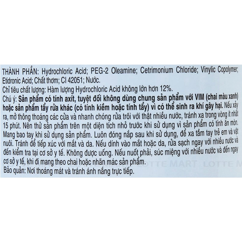 Thành phần: Hydrochloric acid, PEG-2 Oleamine, Cetrimonium Chloride, Etidronic Acid, chất thơm, CI 42051, nước.