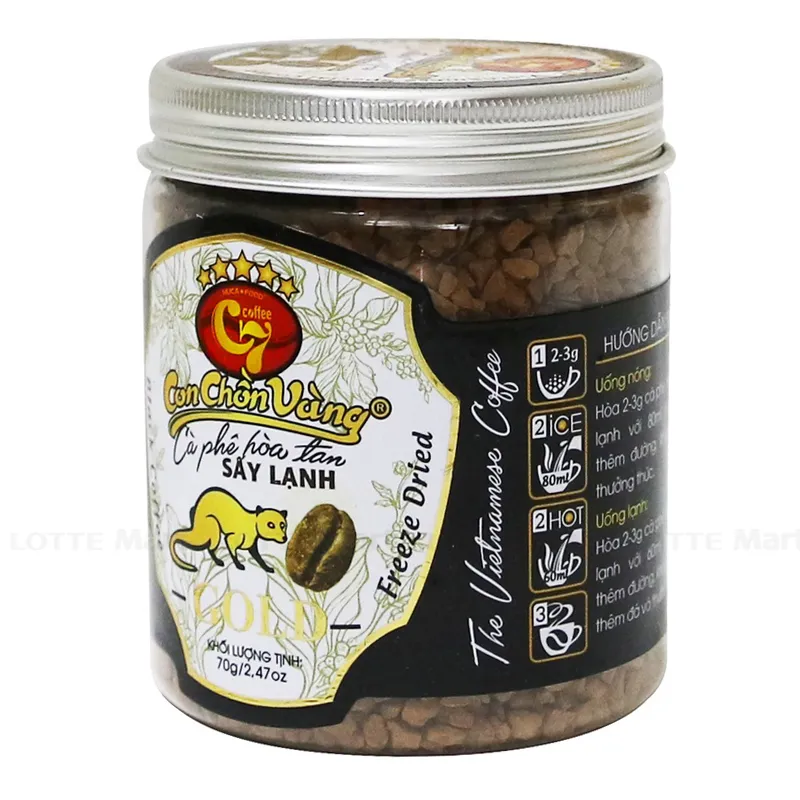 - Cà Phê Hòa Tan Đen Sấy Lạnh Con Chồn Vàng Hộp 70g đang là xu hướng mới của cà phê hòa tan thế giới. Về cơ bản, cà phê hòa tan sấy lạnh có tỉ lệ hồi hương cao hơn cà phê sấy phun và sấy cốm, nên hương vị của loại cà phê này rất hảo hạng và được định vị là cà phê hòa tan chất lượng cao.