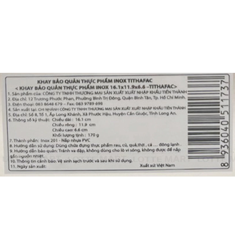 Khay Bảo Quản Thực Phẩm Inox Cao Tithafac 1L