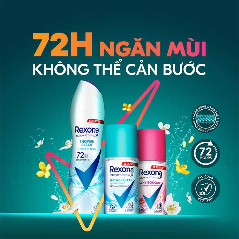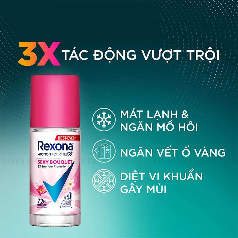 - Lăn Ngăn Mùi Nữ Rexona 72H Khô Thoáng Hương Hoa giúp ngăn mùi và mồ hôi lên đến 72 giờ nhờ công nghệ MotionSense siêu cảm ứng.
