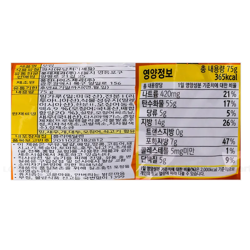 - Sản phẩm được chế biến từ công thức chế biến độc đáo, giúp tạo ra một loại snack giòn tan và đậm đà hương vị. Gói nhỏ gọn 75g của Snack Owings Lotte rất tiện lợi để bạn mang theo bất cứ nơi đâu. Bạn có thể thưởng thức hương vị hải sản đặc trưng của Snack Owings Lotte trong những cuộc dạo chơi, chuyến du lịch hay chỉ đơn giản là khi bạn cần một chút gì đó ngon miệng để thưởng thức.