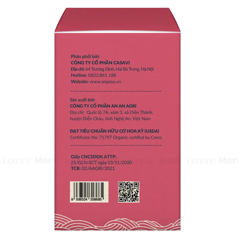 - Sản phẩm Mì rau củ ăn dặm Organic Anpaso đạt chuẩn hữu cơ USDA và được cấp chứng nhận FDA bởi cục quản lý thực phẩm và dược phẩm Hòa Kỳ.