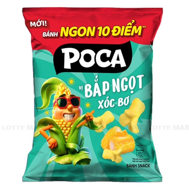 - Snack Poca Bắp Ngọt Xốc Bơ là loại snack bắp ngọt được nhiều người yêu thích bởi bắp giòn và ngọt được xốc trong bột bơ vừa thơm vừa béo giúp từng miếng snack trở nên hấp dẫn, một khi đã thưởng thức là sẽ muốn ăn mãi thôi.