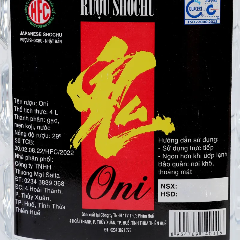 - Rượu Shochu Oni 29% ABV Bình 4000ml là rượu Sochu gạo vô cùng đặc biệt với màu trắng pha lê đặc trưng, vẻ ngoài sang trọng mang đậm phong cách Nhật cùng hương vị hoàn hảo. Nó thích hợp để thưởng thức trong những dịp khác nhau như bữa cơm gia đình, buổi họp mặt, tiệc tùng hoặc làm quà biếu tặng.