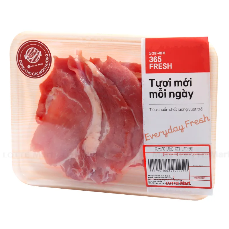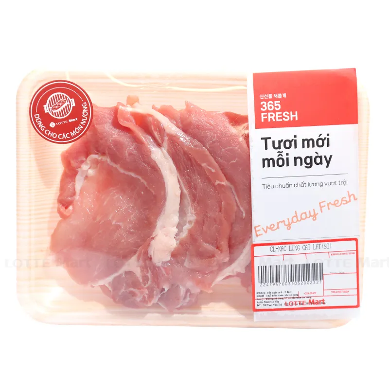 - Nạc lưng cắt lát 365 Fresh là thịt nạc được lấy ra từ phần xương sườn của con heo. Thịt mềm, thớ thịt nạc đan xen với vân mỡ không có gân, thích hợp cho các món nướng.