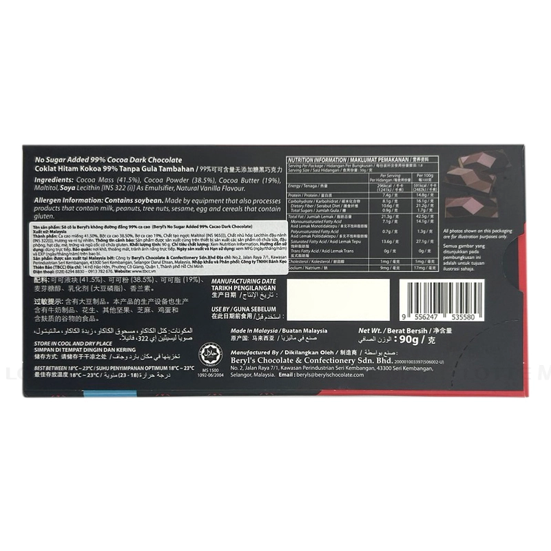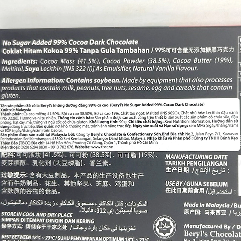 - Socola Beryl's Không Đường 99% Cacao Dark là một lựa chọn tuyệt vời cho những tín đồ yêu thích socola đen và muốn thưởng thức hương vị nguyên chất, ít ngọt. Với thành phần cacao 99%, sản phẩm mang lại vị socola đen đậm đà, đầy quyến rũ, phù hợp cho những người yêu thích vị đắng của cacao.