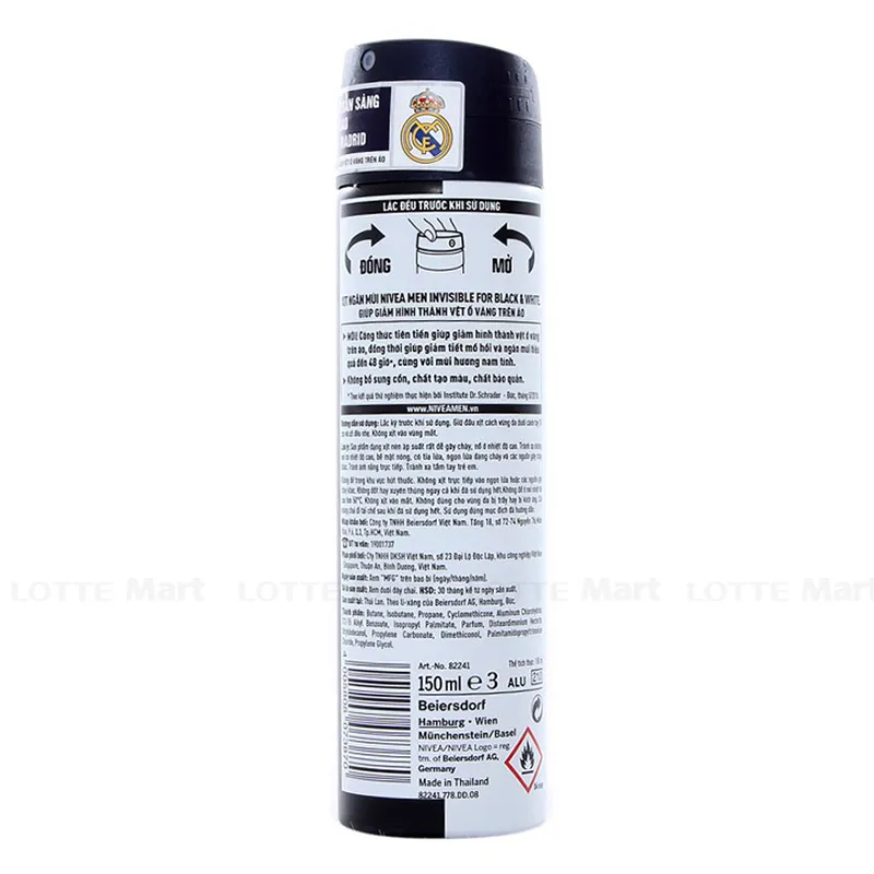 Xịt Ngăn Mùi Nivea Men Invisible For Black & White Ngăn Vệt Ố Vàng 150ml với công thức độc quyền giúp giảm tiết mồ hôi và ngăn mùi hiệu quả lên đến 48 giờ, đồng thời giúp giảm hình thành vệt ố vàng trên áo so với các sản phẩm khử mùi thông thường. Sản phẩm đã được kiểm nghiệm da liễu, không bổ sung cồn, chất tạo màu, chất bảo quản, an toàn cho làn da nhạy cảm.