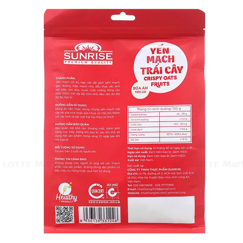 Yến Mạch Trái Cây Sunrise với thành phần chính là yến mạch úc nguyên chất, có rất nhiều công dụng rất tốt cho làn da, giúp sáng da, giảm thâm nám hạn chế lão hóa, da căng mịn tự nhiên, ngoài ra còn giúp hệ tim mạch hoạt động khỏe mạnh ổn định vì có chứa rất nhiều chất xơ hòa tan giúp hạn chế nguy cơ bị nhồi máu cơ tim.