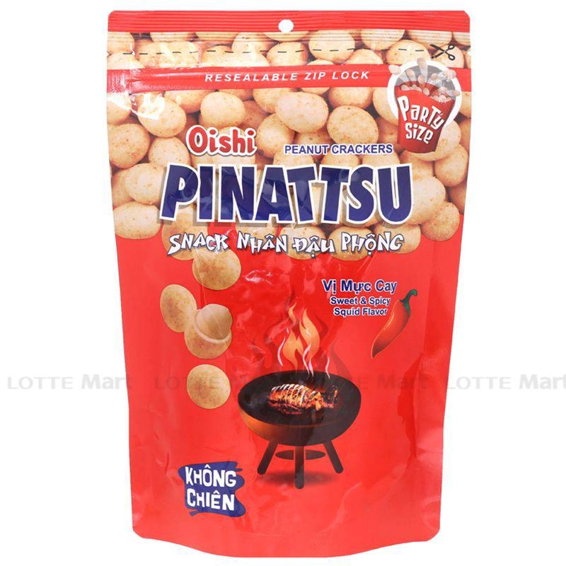 Snack Nhân Đậu Phộng Vị Mực Cay Pinattsu Oishi thơm, béo bùi của đậu phộng được bọc trong lớp bột với hương vị mực cay the the, thơm béo béo hấp dẫn.