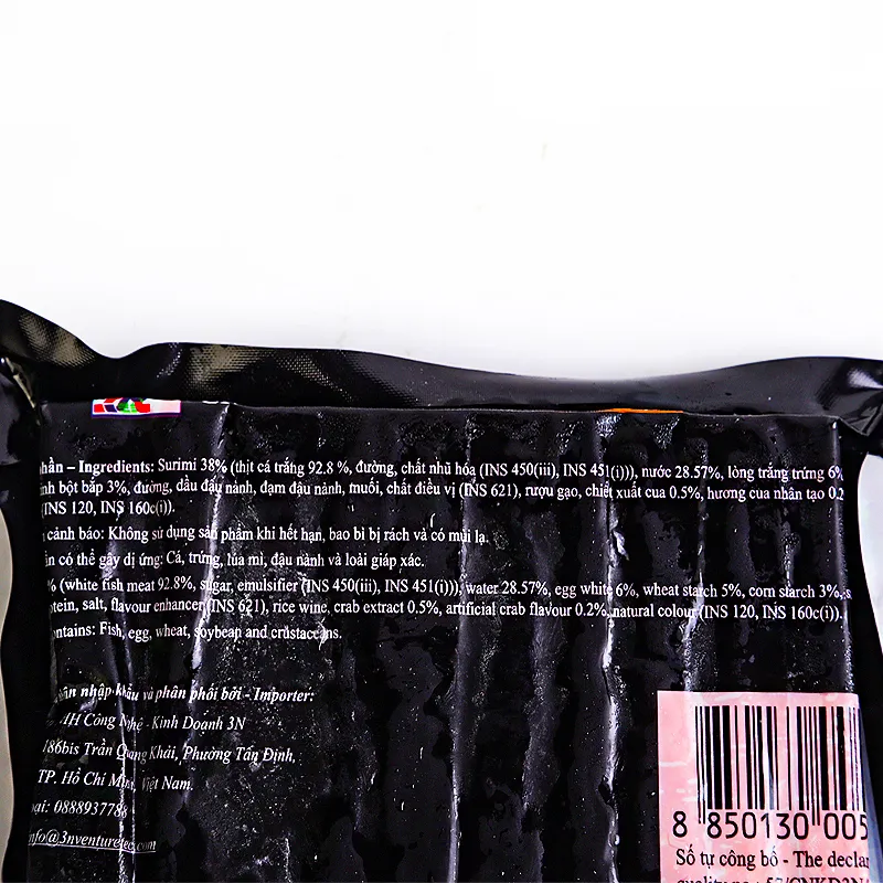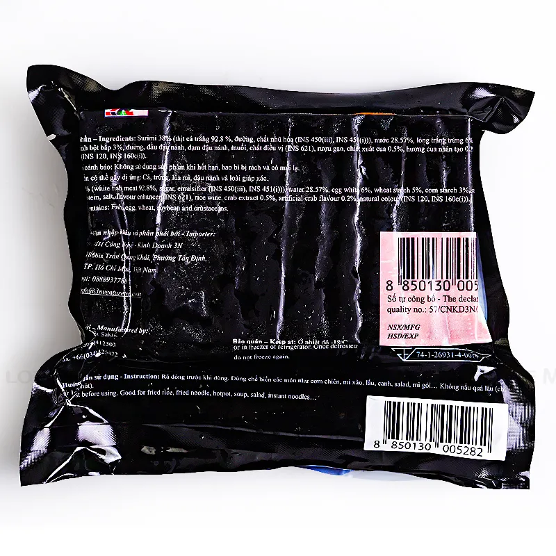 Thành phần: Surimi, nước, lòng trắng trứng, tinh bột lúa mì, tinh bột bắp, đường, dầu đậu nành, muối, chất điều vị,...