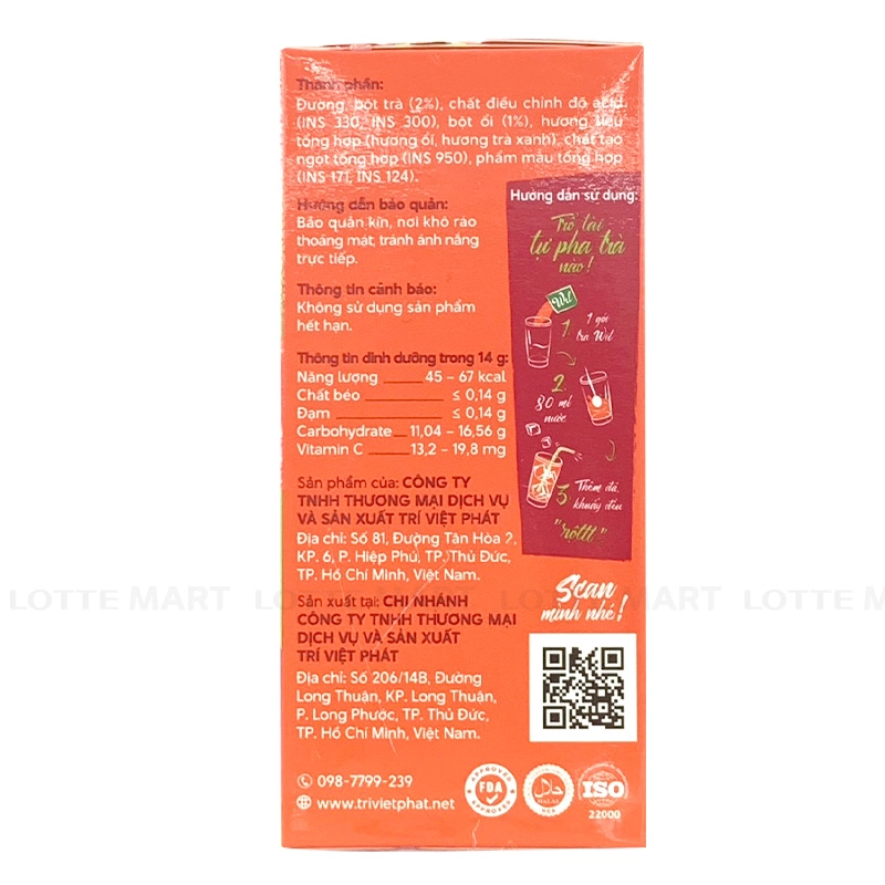 - Đường, chất điều chỉnh độ acid (330), tinh chất trà (2%), hương ổi tự nhiên và tổng hợp, vitamin C (0,17%), chất tạo ngọt tổng hợp (950), hương trà xanh tổng hợp, màu tổng hợp (171, 124).