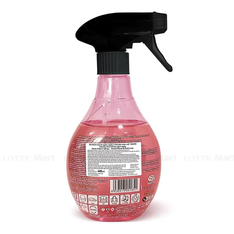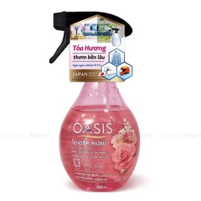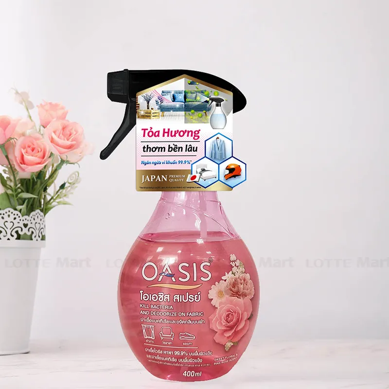 - Xịt Khử Mùi Trên Vải Oasis Ngăn Ngừa Vi Khuẩn Trên Vải Hương Hoa Hồng Sweet Floral & Pink Rose 400ml phù hợp sử dụng cho các vật dụng bằng vải.