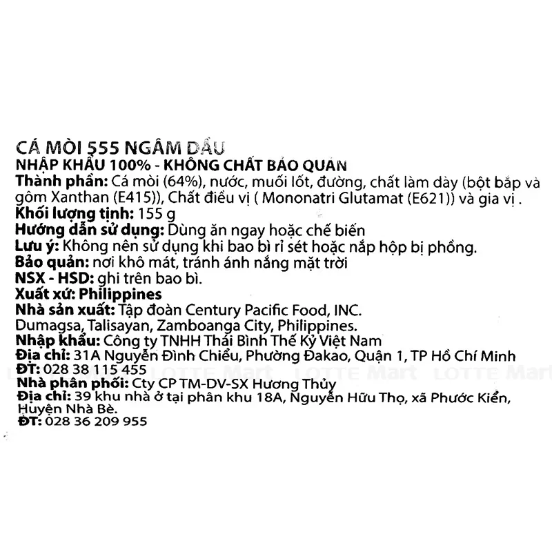 Cá Mòi Ngâm Dầu 555 là một sản phẩm đến từ Philippines. Sản phẩm với thành phần chính là cá mòi được chọn lọc kĩ càng, an toàn cho sức khỏe. Hơn nữa, cá mòi giàu canxi, vitamin B, vitamin D và các khoáng chất nên rất tốt cho sức khỏe.