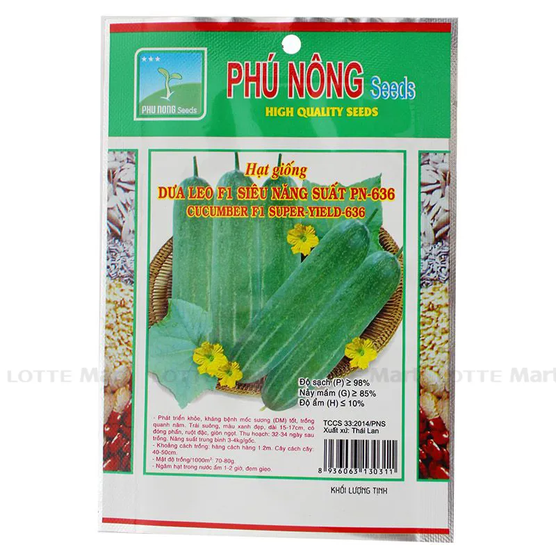 Đặc tính hạt giống Dưa Leo F1 Phú Nông PN-636: Sinh trưởng phát triển mạnh, kháng bệnh mốc sương tốt. Có thể trồng quanh năm. Trái suông, màu rất đẹp, trái dài 15-17cm, có đóng phấn, ruột đặc, giòn ngọt, có thể bảo quản được lâu, vận chuyển xa tốt.