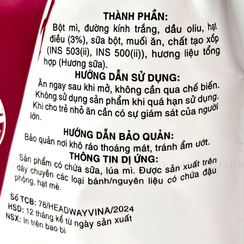 - Thông tin dị ứng: Sản phẩm có chứa sữa, lúa mì. Được sản xuất trên dây chuyền các loại bánh/nguyên liệu có chứa đậu phộng, hạt mè.